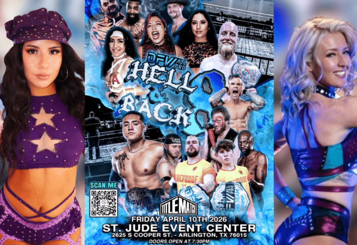 playDFW All-Pro returns with Hell & Back 8, headlined by Ladies Night Out Champion Jazmin Allure defending her title against Ray Lyn in a stacked night of championship action.