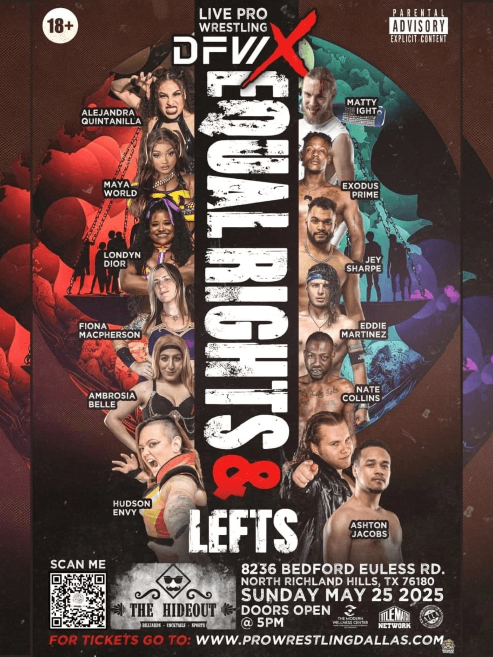 DFW All-Pro proudly presents “Equal Rights & Lefts” – a no-holds-barred, full-throttle night of intergender wrestling action featuring your favorite stars and future legends! Don’t miss this unforgettable night of fierce rivalries, title fights, and boundary-breaking competition.