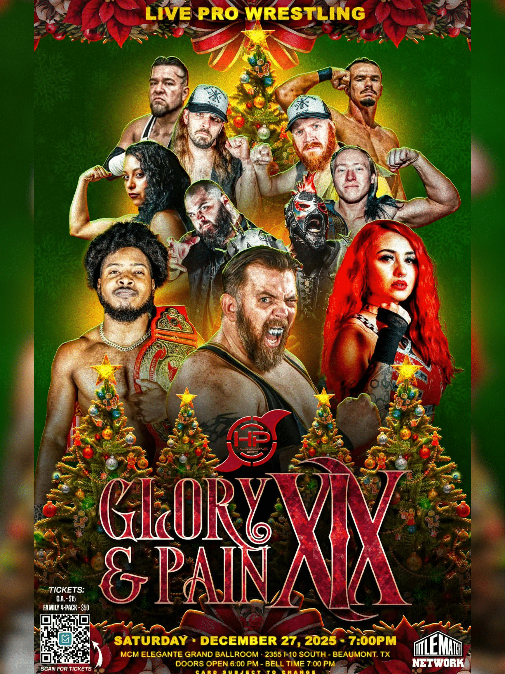 Hurricane Pro Wrestling presents Glory & Pain XIX, an explosive night of professional wrestling where championships are defended and careers are tested in the ring.